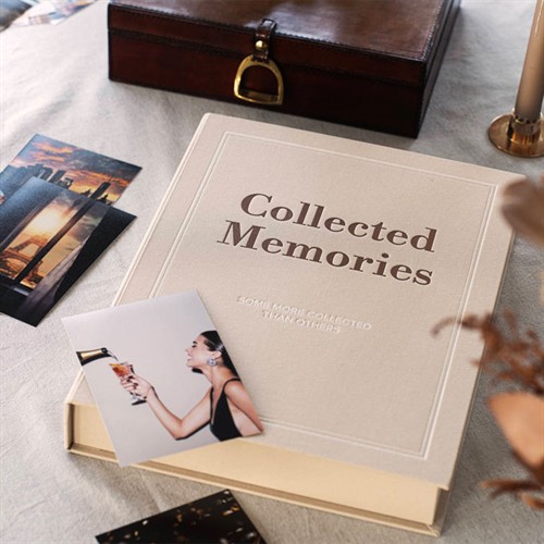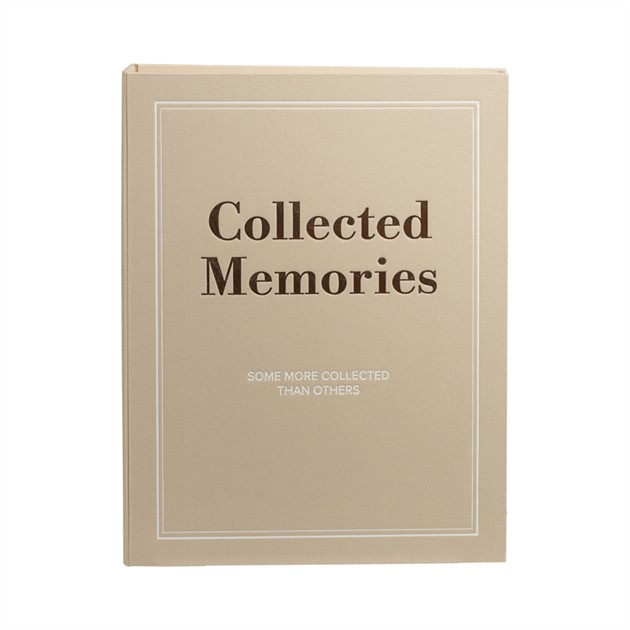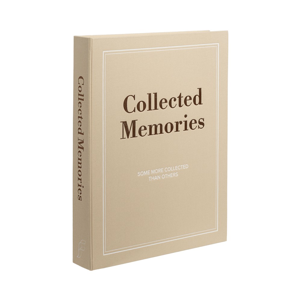 Albumet har ett elegant beige textilomslag och den lekfulla texten “Collected Memories (some more collected than others)” på framsidan. En kombination av mjuk elegans och varm humor som gör att det sticker ut på soffbordet – och lockar till att bläddra.