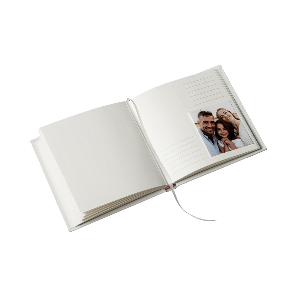 Albumet har en vit textilklädd omslag med en mjuk, elegant struktur som passar i alla hem. De tjocka kartongbladen ger en exklusiv känsla och gör det enkelt att klistra in och bevara dina favoritbilder på ett säkert och snyggt sätt.