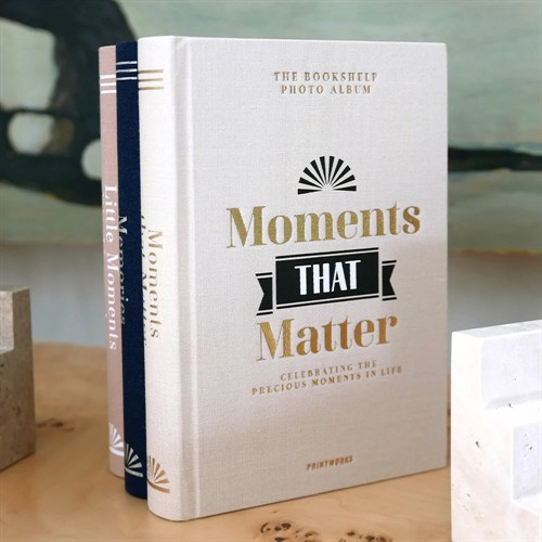 Moments that matter mäter 14x21cm och har ett hårt omslag klätt i beiget tyg med guldfolierad text. Det är ett stilfullt alternativ till deras traditionella, lådliknande coffee table-album.