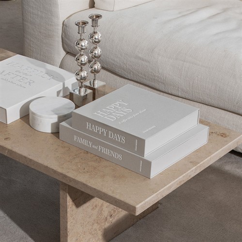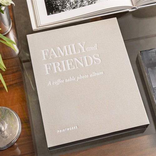 Upptäck Printworks Family and Friends Coffee Table fotoalbum - ett elegant fotoalbum med ljusgrått tygomslag och vit text.