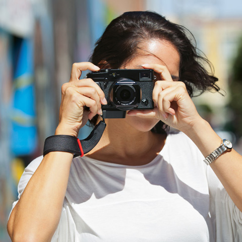 I en mjuk rörelse kan remmen ändras för att bli en fullängds halsrem, vilket lämnar händerna fria för andra saker, som att t.ex. byta ett objektiv.