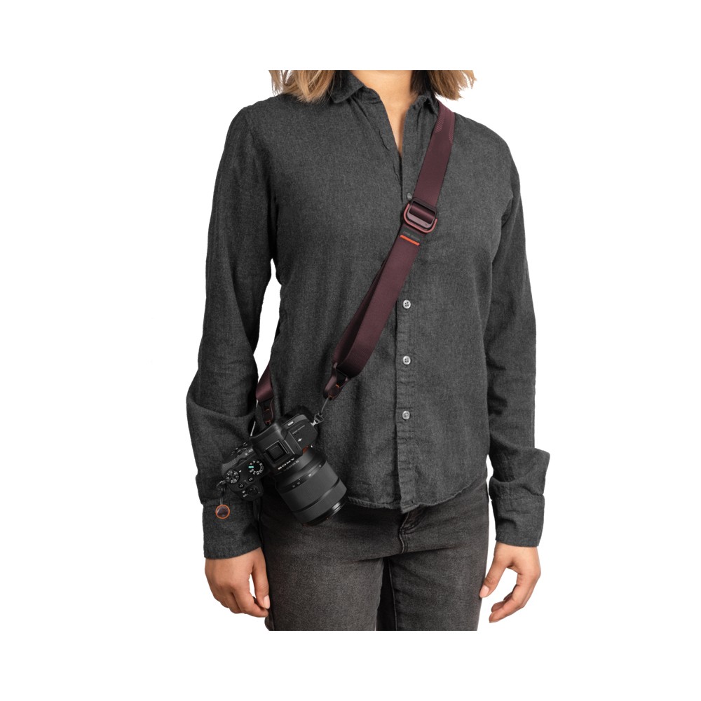 Slide Lite kan användas som axelrem, nackrem eller sele. Ena sidan är slät och glider lätt över kläder, medan den andra har silikon som håller remmen på plats. Dubbla snabbjusteringar gör det enkelt att anpassa remmen för alla aktiviteter. När du inte fotograferar kan kameran fästas tätt mot kroppen för säker transport.