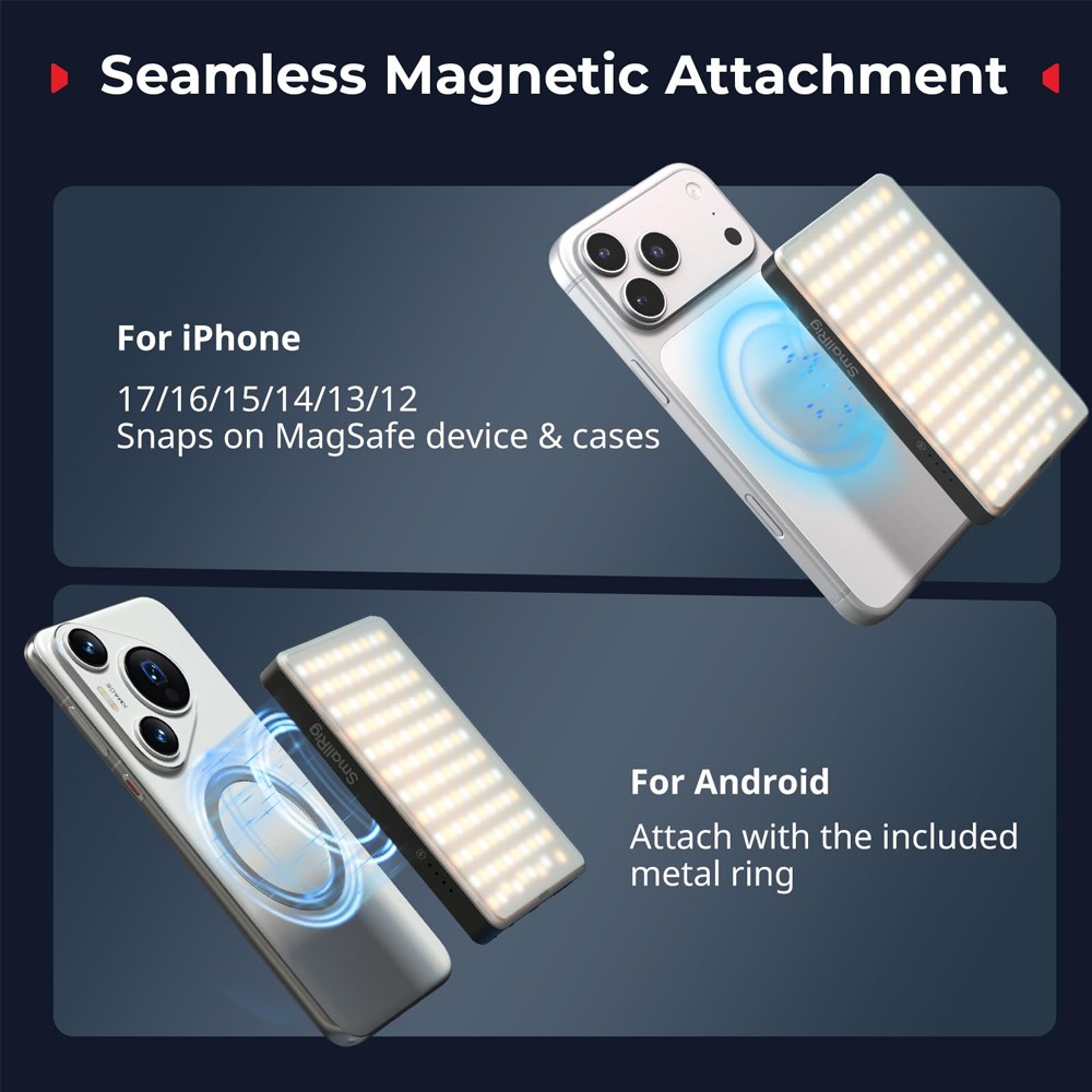 Erbjuder mångsidiga monteringslösningar med MagSafe-kompatibilitet för omedelbar montering och demontering. Den fungerar smidigt med MagSafe-kompatibla iPhones eller kan enkelt kopplas ihop med Android-enheter med hjälp av den medföljande metallringen – för säker montering på bara en sekund! Dessutom har den en snabbkopplingsbas som gör det möjligt att montera den horisontellt eller vertikalt på bildskärmar eller bärbara datorer på några sekunder, komplett med 170° lutningsjustering för perfekt positionering – vilket garanterar verktygsfri installation och problemfri belysningsinstallation!