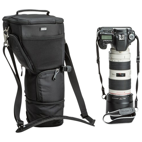 Unikt hölster utvecklat för en greppad systemkamera med 70-200 mm f/2.8 och objektivskydd i fotograferingsläge.