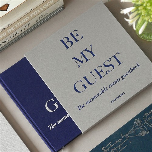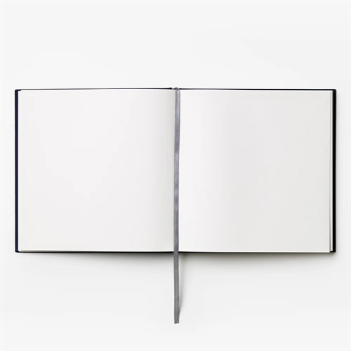 Gästboken innehåller 100 sidor och levereras i ett elegant grått skyddsetui som bevarar och skyddar den marinblå boken.