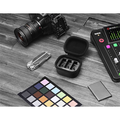 Röde Wireless Go II Charge Case är ett praktiskt laddningsfodral för Wireless GO II. Den rymmer två sändare och en mottagare och har ett integrerat batteri som möjliggör tre fulla laddningar av systemet för upp till 30 timmars kontinuerlig användning. Med ett robust hölje och dragkedja är den också perfekt för att skydda Wireless GO II när den transporteras eller förvaras.