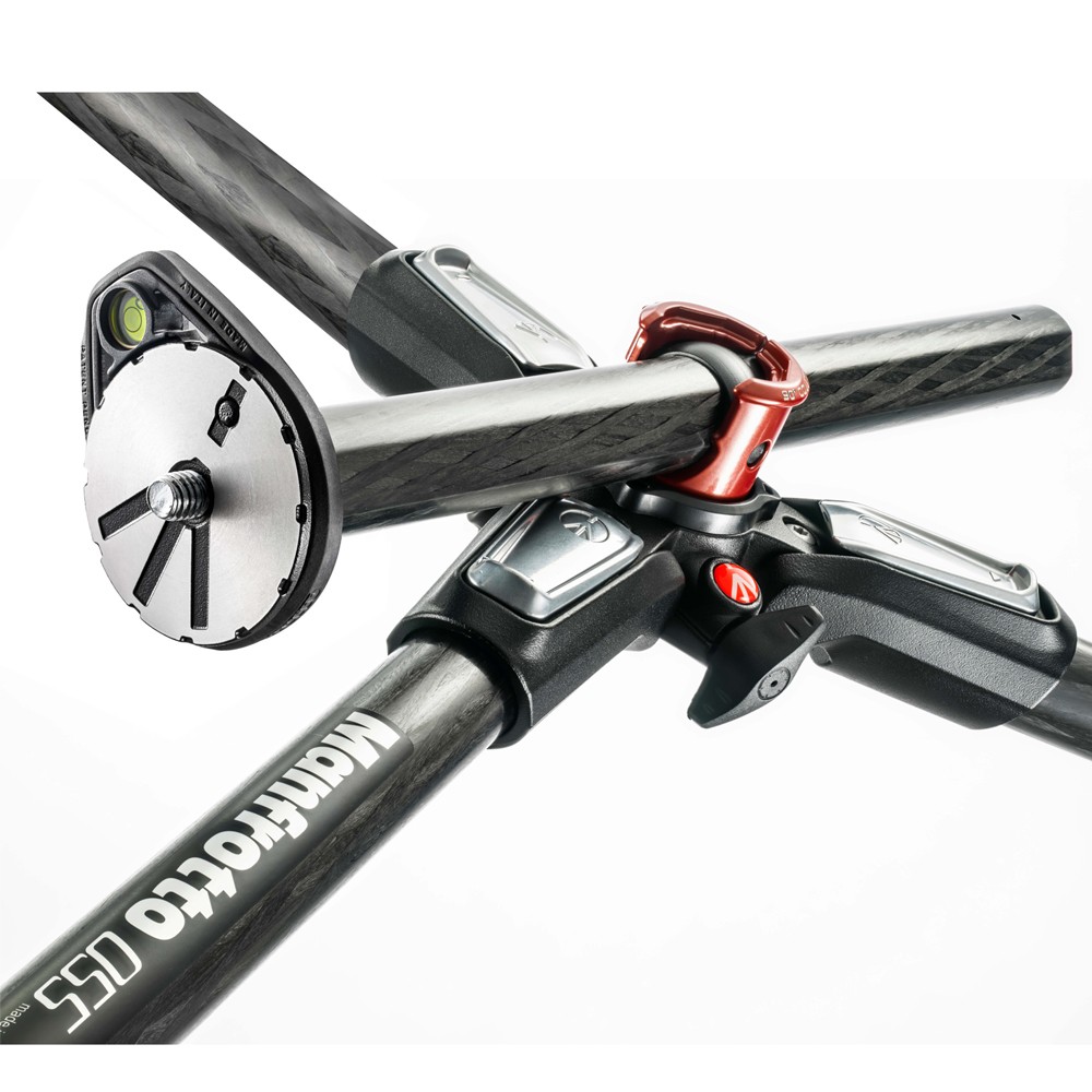 Ett vattenpass är inbyggt i toppen av mittpelaren för exakt inramning. Vattenpasset roterar fritt runt mittpelaren, så att den kan placeras där det är enklast för dig att se den medan du justerar stativet, och utan att det skyms av det monterade huvudet och kameran, eller kommer i vägen för huvudet eller kamerareglage.