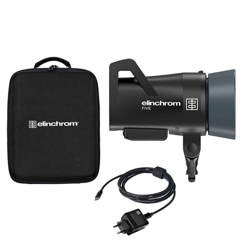 Elinchrom FIVE batteridriven studioblixt i kit med USB-C laddare och väska.