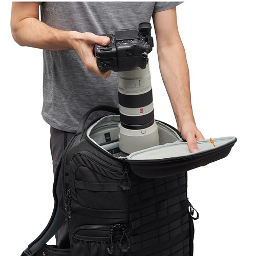 Det innovativa avdelarsystemet möjliggör sömlös fastsättning och exakt placering, vilket säkerställer att din utrustning är välorganiserad och skyddad. Ryggsäcken har också en CradleFit-ficka för bärbar dator som passar upp till en 16" MacBook Pro, samt ytterligare fickor för tillbehör och en 1L-flaska. Det modulära SlipLock-fästsystemet ger ytterligare anpassningsmöjligheter med medföljande tillbehör som påsar och remmar.